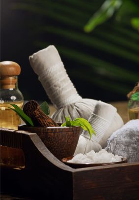 Terapia con pindas herbales calientes para aliviar tensión muscular.
