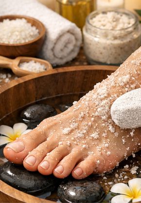 Pediluvio aromático, exfoliación y masaje de pies relajante.